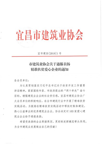 为了认真贯彻落实习近平总书记关于扶贫开发工作重要讲话精神,2018年1月,在宜昌市建筑业协会的号召下,紧紧围绕市委、市政府提出的“两个率先”奋斗目标,中欧网页版登录入口参与了精准扶贫实践活动。在此次活动中受到协会“爱心企业”表扬。帮扶村集体建设,热心于公益事业,是中欧网页版登录入口的社会责任。把爱传递,是每个正天人的美德。