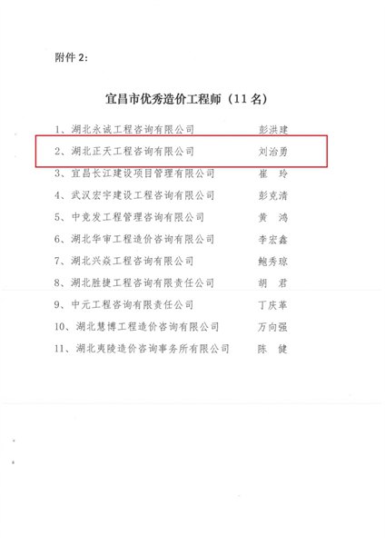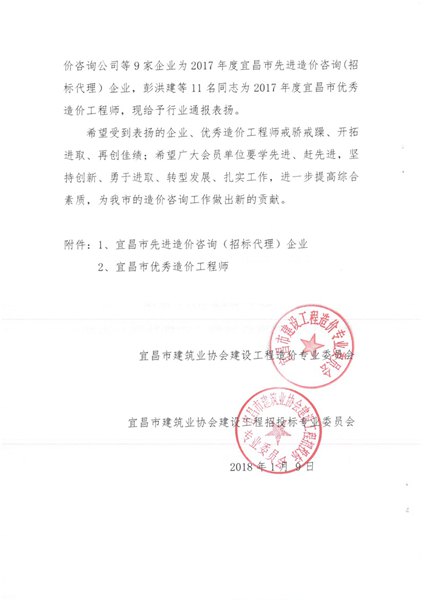 2017年度宜昌市先进造价咨询(招标代理)企业、优秀造价中欧(中国)师