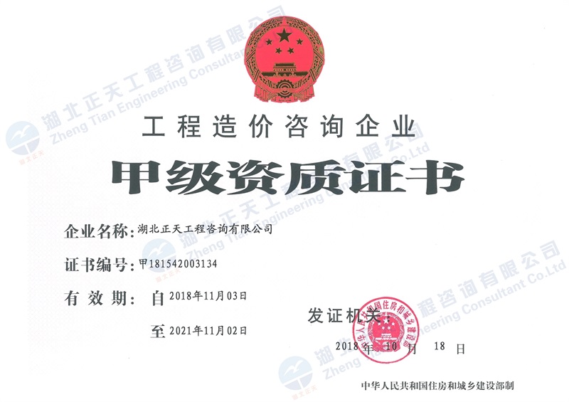 中欧(中国)造价咨询甲级资质证书
