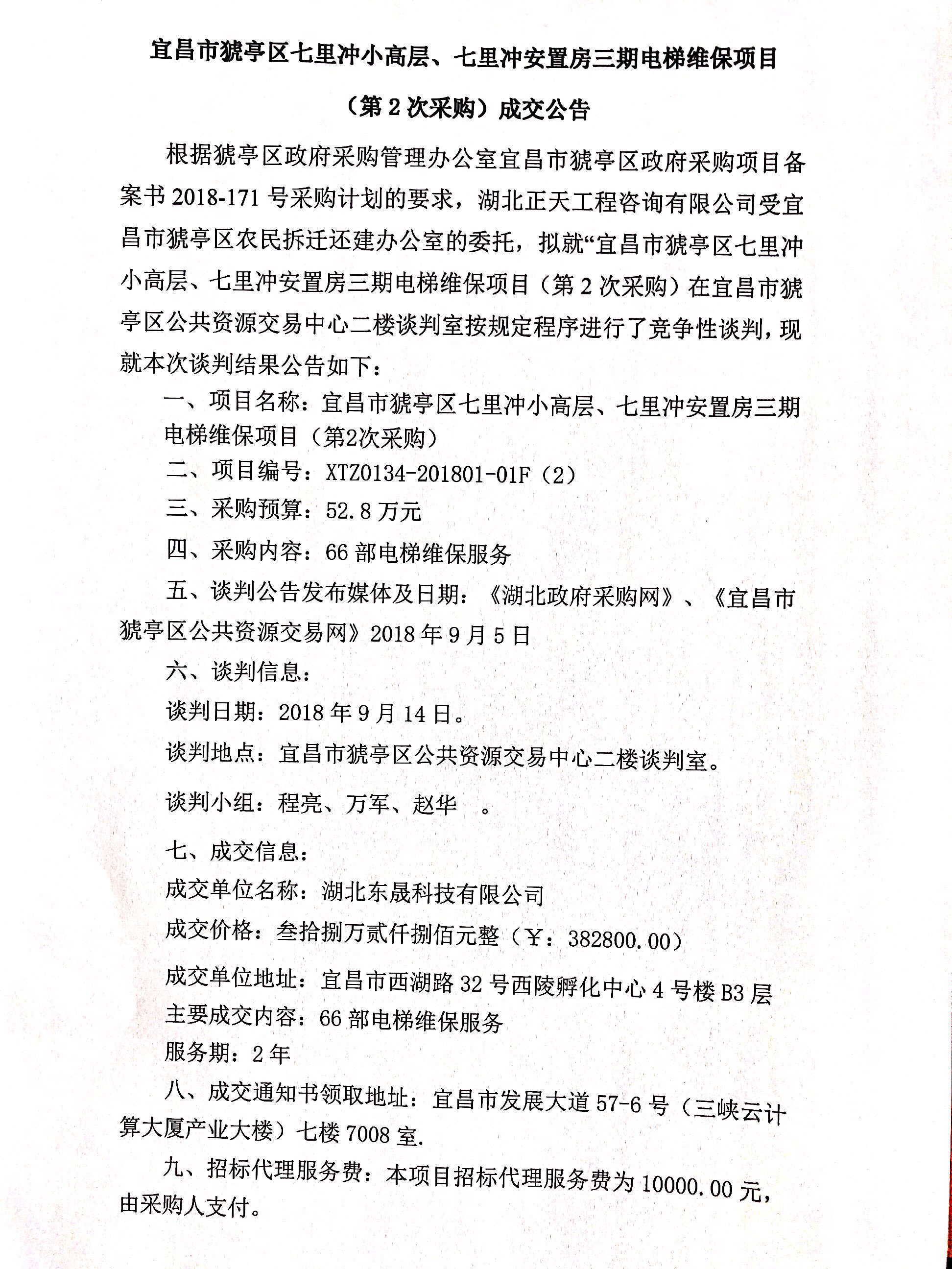 一、项目名称:宜昌市猇亭区七里冲小高层、七里冲安置房三期电梯维保项目(第2次采购)