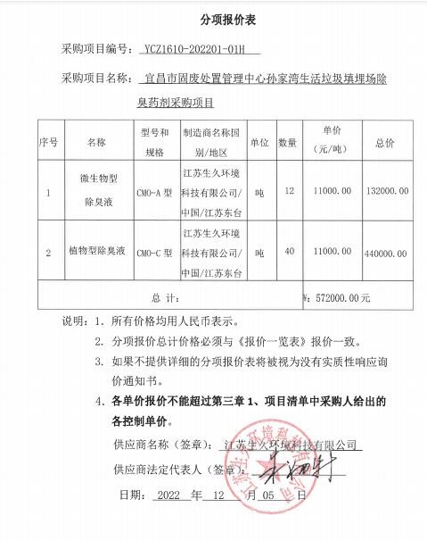 名称:宜昌市固废处置管理中心孙家湾生活垃圾填埋场除臭药剂采购项目 品牌:详见附件 规格型号:详见附件 数量:详见附件 单价:详见附件 |