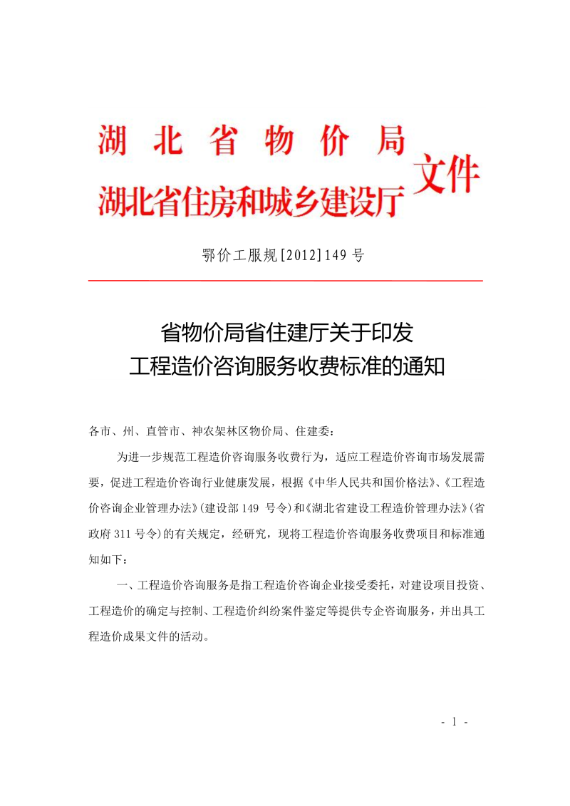 省物价局省住建厅关于印发中欧(中国)造价咨询服务收费标准的通知 鄂价工服规【2012】149号